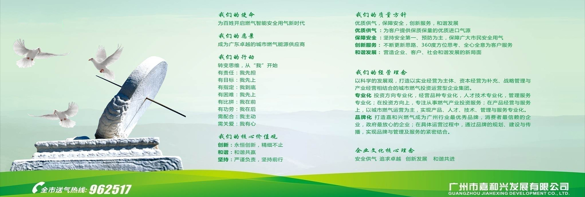 ——廣州市嘉和興發(fā)展有限公司于2001年3月1日注冊成立,主要從事瓶裝液化石油氣(LPG)批發(fā)貿(mào)易,民用、工業(yè)用液化石油氣,工業(yè)用氣體,汽車加氣站及危險品物流運(yùn)輸?shù)?,總部設(shè)在廣州。目前公司經(jīng)營三個液化氣充裝站、一個汽車加氣站:白云區(qū)神山達(dá)嶺液化石油氣站、白云區(qū)加禾氣站和佛山市南海區(qū)冠順氣站,黃埔區(qū)塘口汽車加氣站,總庫容接近800立方米。